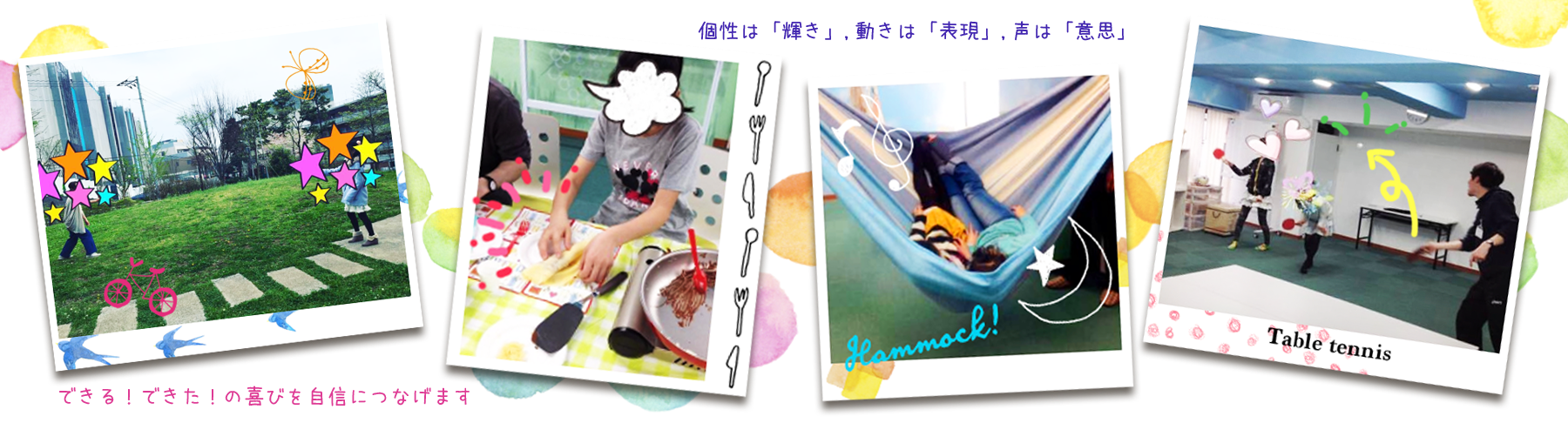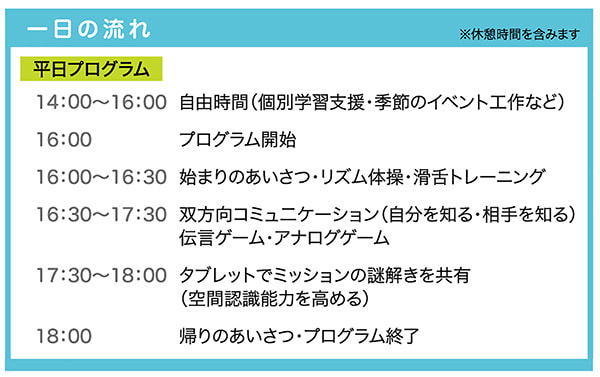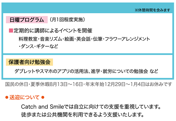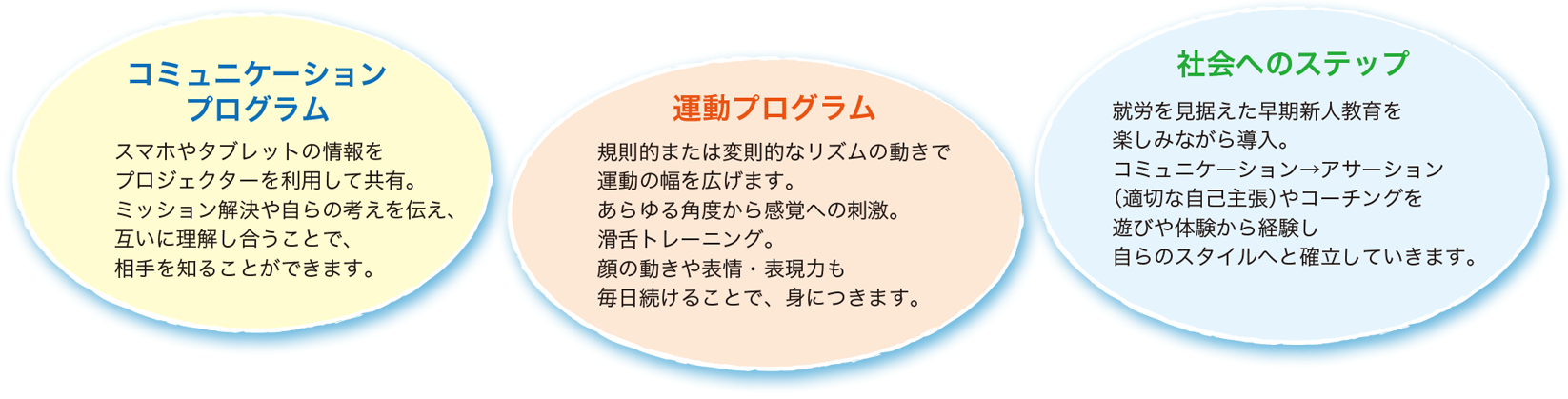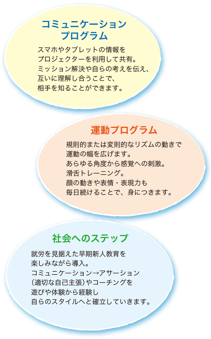 Catch and Smile では場面ごとのあいさつ・滑舌トレーニング・視機能トレーニング・テーマごとのミッション(グループ)・ハンモックの癒し・感覚統合などを毎日繰り返しおこなうことで、お子さまの成長を支援していきます。
